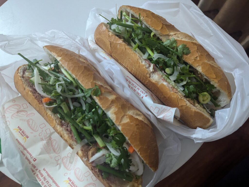 Nach einer kurzen Pause zu Hause, um ein wenig abzukühlen (die Mittagssonne war sehr stark), ging es dann weiter im Programm. Als Mittags-Snack haben wir uns am zweiten Tag wieder ein Banh Mi geholt. Dieses Mal in der veganen Variante, mit verschiedenem Fleischersatz belegt.